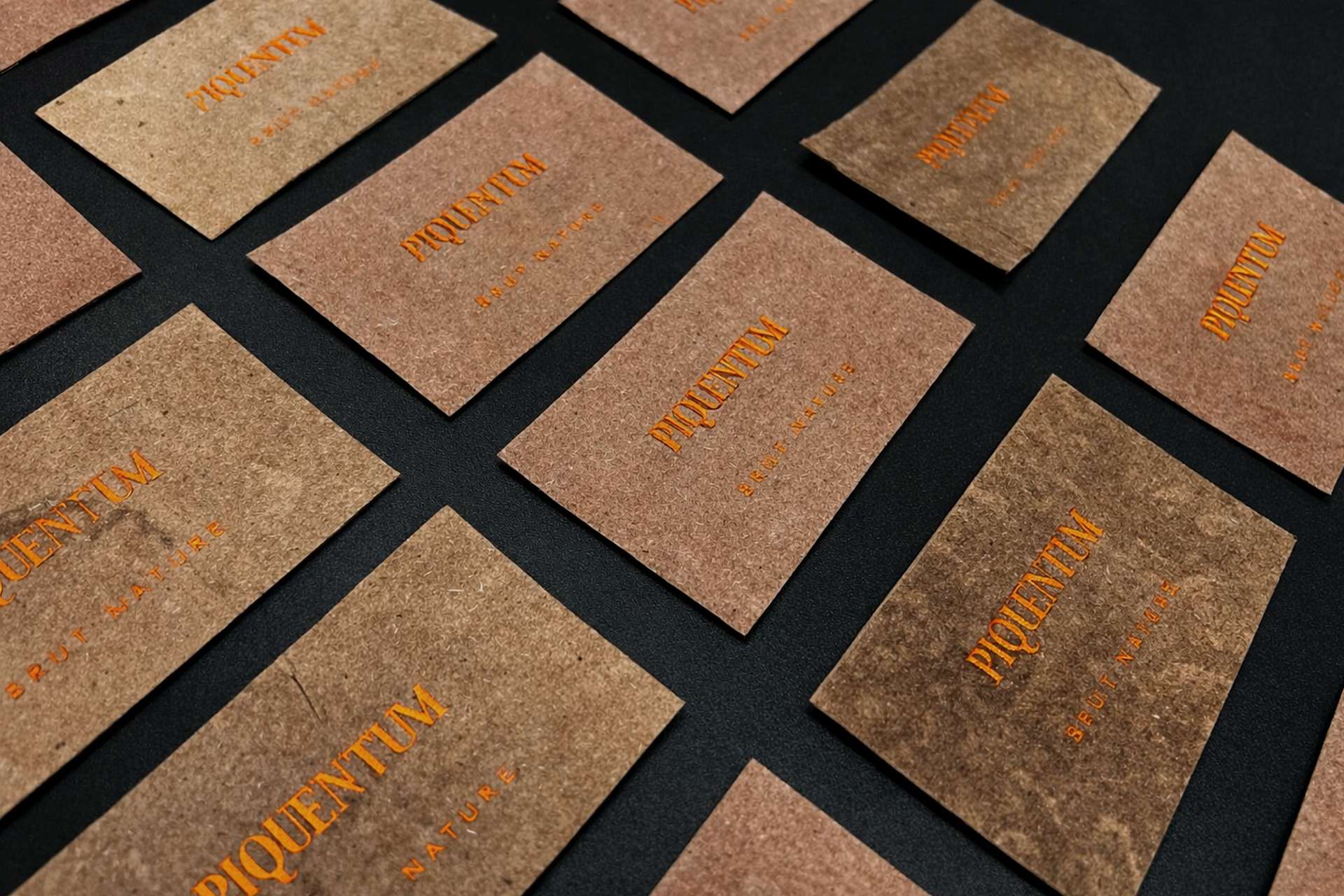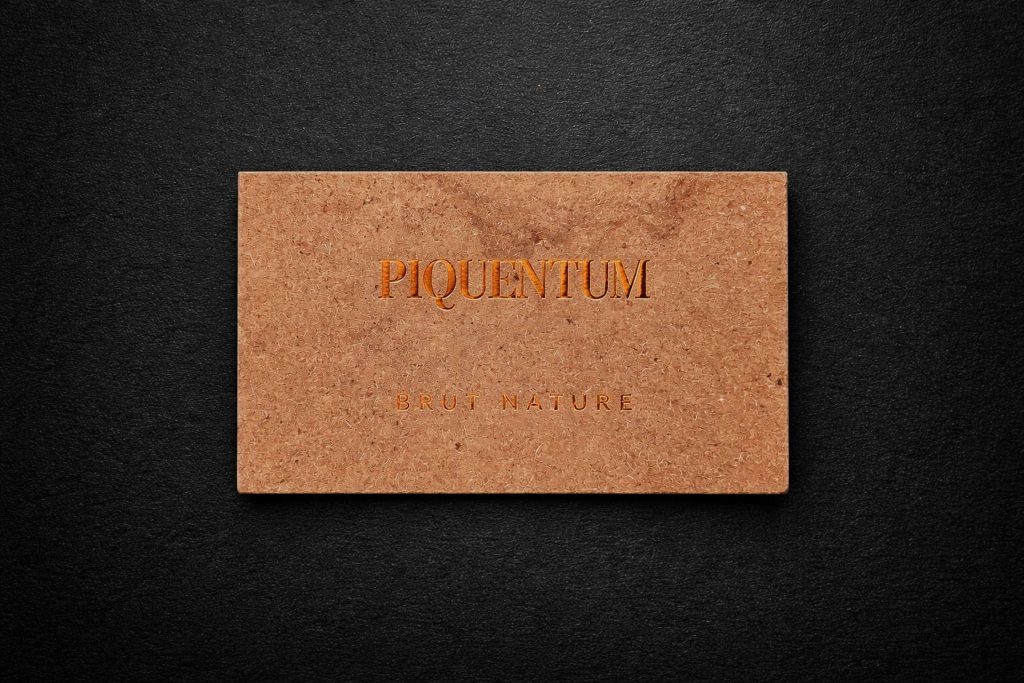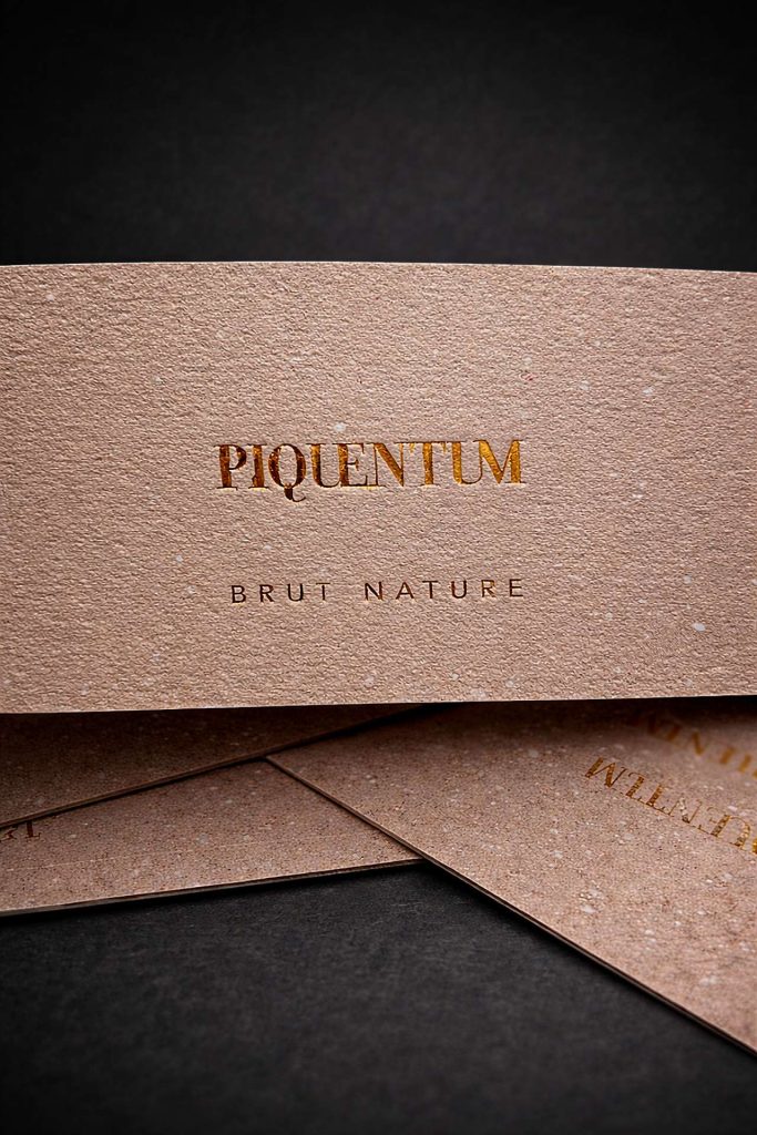 Piquentum Brut Nature etiketa nije rezultat klasičnog dizajnersko-grafičkog promišljanja u kojem se bira papir, boja i završna obrada. Nastala je kao rezultat radikalne odluke da se krene iz samog izvora proizvoda. Iz vina.